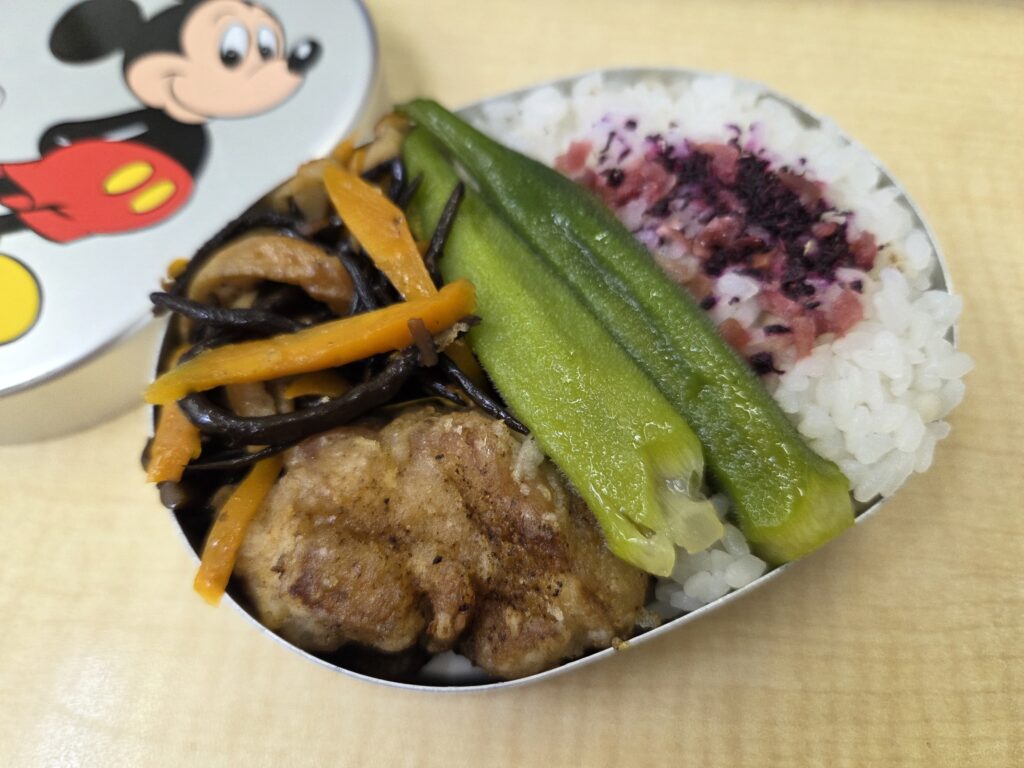 この日は、オクラのお浸し、ヒジキ煮、鶏のから揚げ弁当です☺